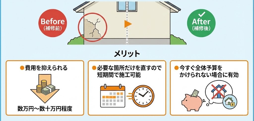 ●費用を抑えられる(数万円〜数十万円程度) ●必要な箇所だけを直すので短期間で施工可能 ●今すぐ全体予算をかけられない場合に有効 |