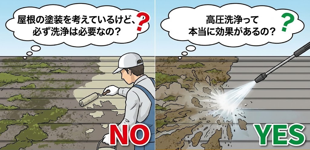 「屋根の塗装を考えているけど、必ず洗浄は必要なの?」 屋根塗装を検討する方からよく寄せられる疑問です。 |
