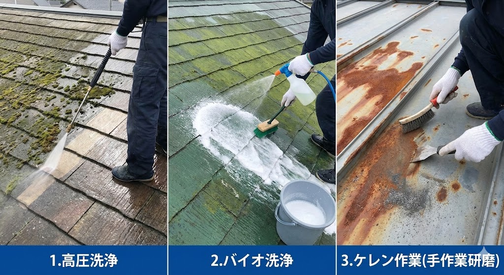 1.高圧洗浄 2.バイオ洗浄 湿気の多い蒲郡市では特に有効。 3.ケレン作業(手作業研磨) |