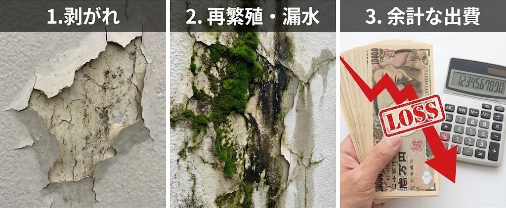 ●塗料が密着せず、数年で剥がれる ●コケや藻が再繁殖し、防水性が低下 ●修繕費がかさみ、再施工で余計な出費につながる 👉 洗浄は「ただの掃除」ではなく、塗装の耐久性を決める必須工程です。 |