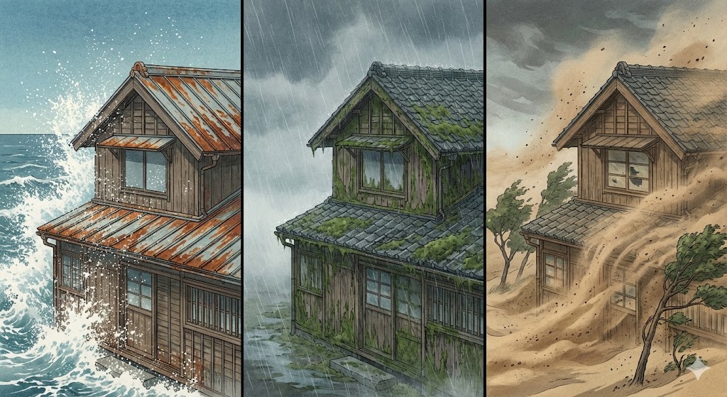 蒲郡市は三河湾に面しており、以下のような屋根トラブルが起きやすい地域です。
