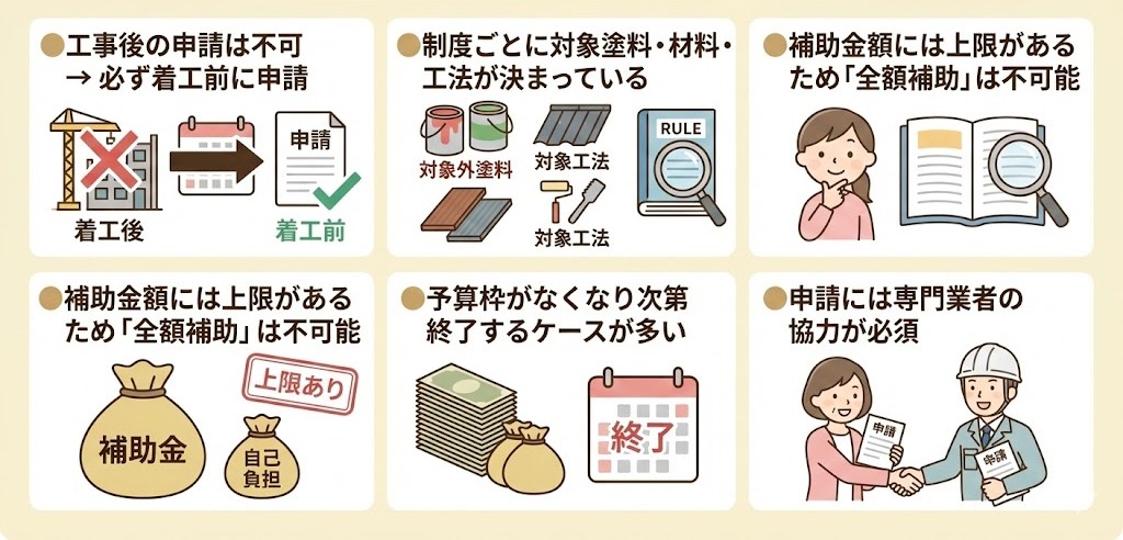 ●工事後の申請は不可 → 必ず着工前に申請 ●制度ごとに対象塗料・材料・工法が決まっている ●補助金額には上限があるため「全額補助」は不可能 ●予算枠がなくなり次第終了するケースが多い ●申請には専門業者の協力が必須 |