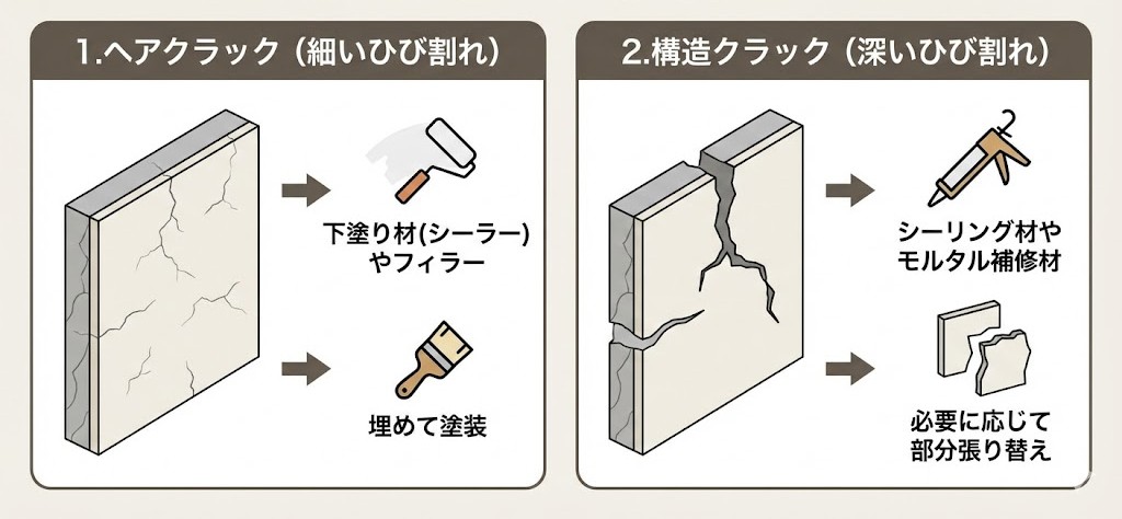 1.ヘアクラック(細いひび割れ) 2.構造クラック(深いひび割れ) 👉 放置すると雨水が浸入し、内部劣化や雨漏りにつながるため早期対応が重要です。 |