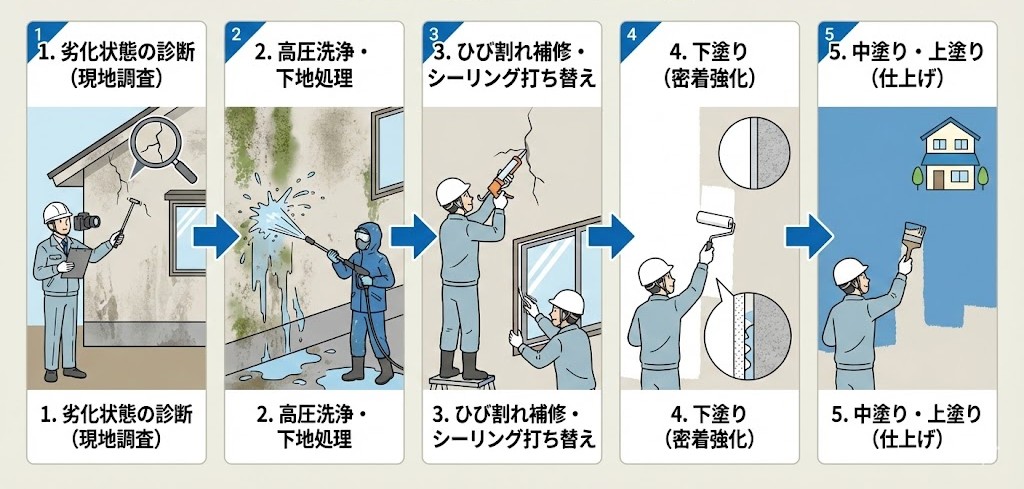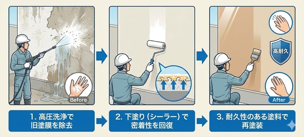 ●高圧洗浄で旧塗膜を除去 ●下塗り(シーラー)で密着性を回復 ●耐久性のある塗料で再塗装 👉 白い粉が出た状態でそのまま塗装しても密着せず、数年で剥がれます。 |
