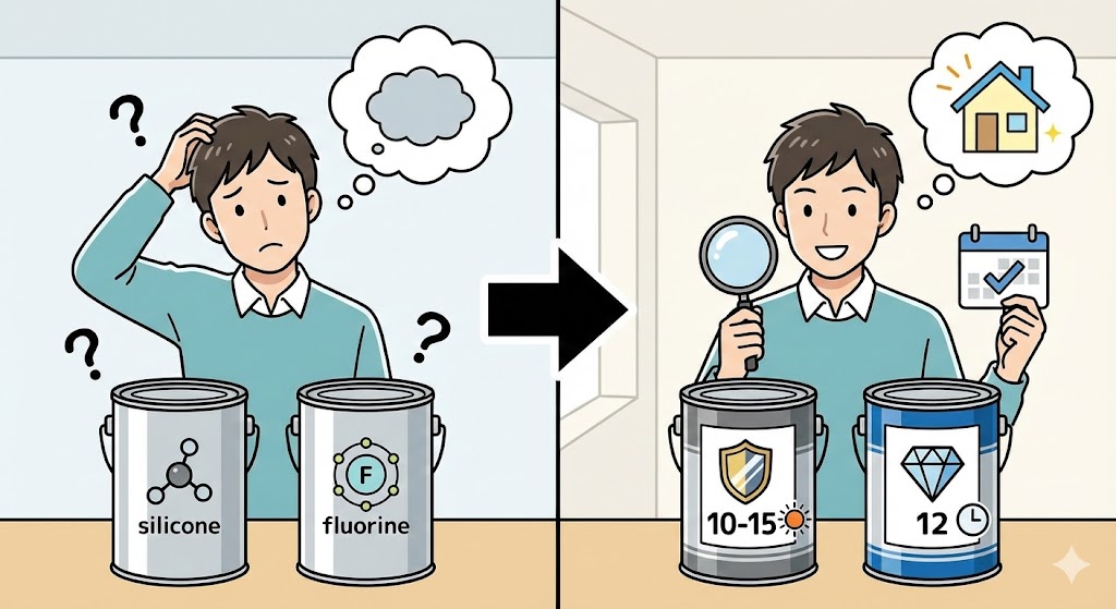 「シリコン」「フッ素」などのグレードだけでなく、具体的な製品名と耐用年数を必ず確認しましょう。 例: ●日本ペイント「ファインパーフェクトトップ」(耐用10〜15年) ●エスケー化研「プレミアムシリコン」(耐用12年) |