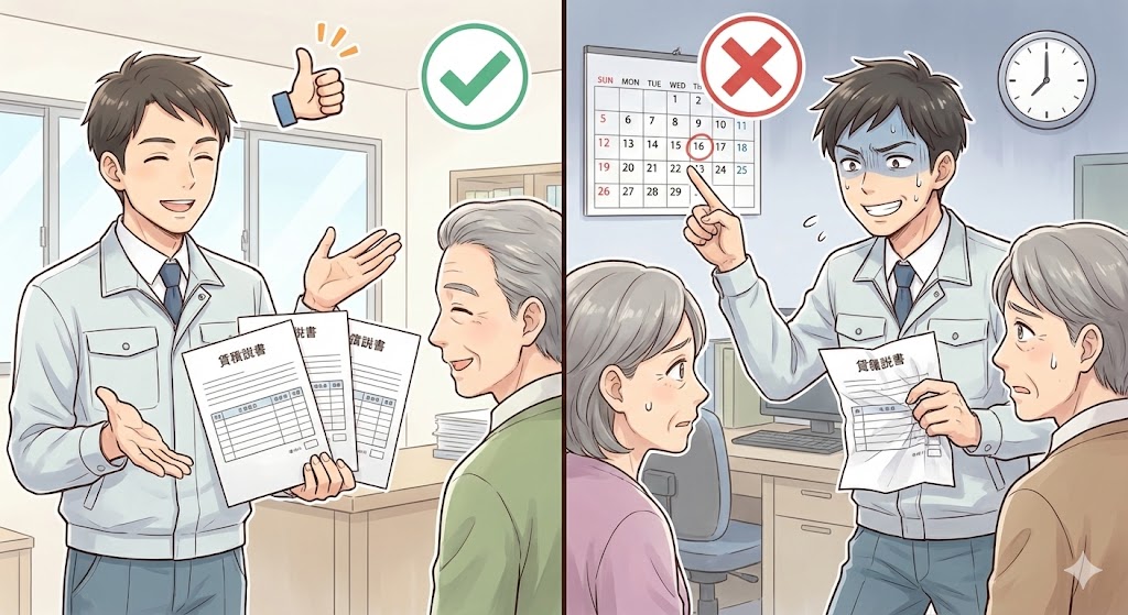 | 優良業者なら「ぜひ比較してください」と答えます。 逆に「今日決めたら割引します」と急かす業者は要注意。 |