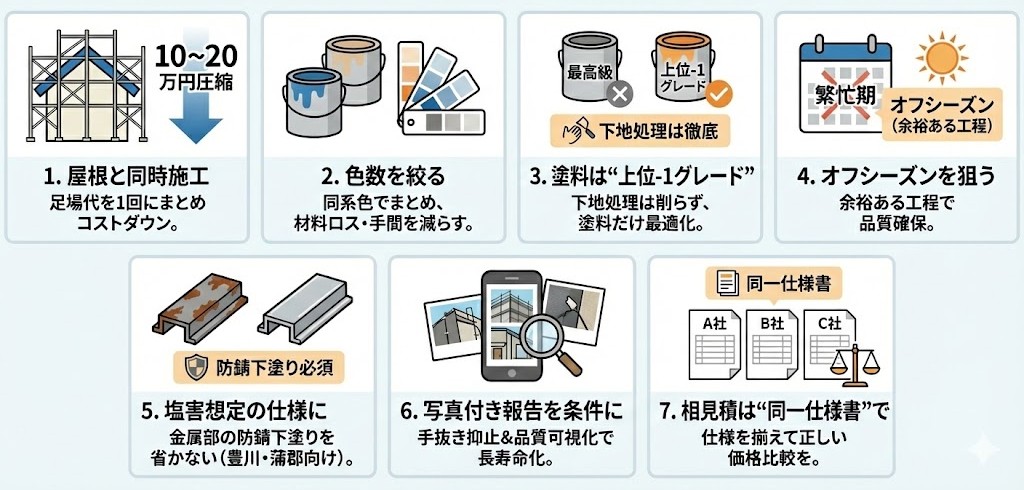 ●塩害対策:金属部はケレン+防錆下塗りが増え、工程・材料が上積み。