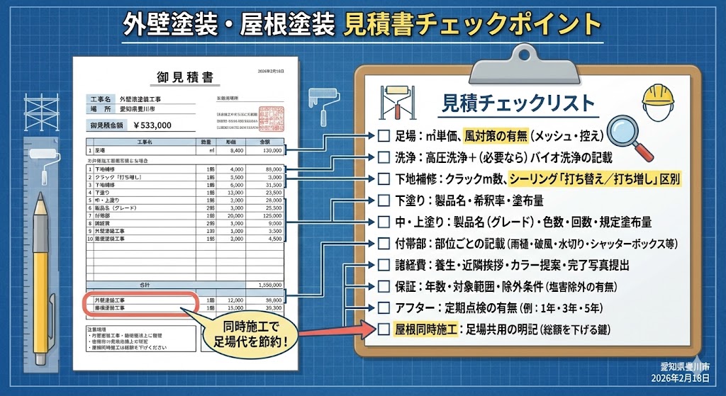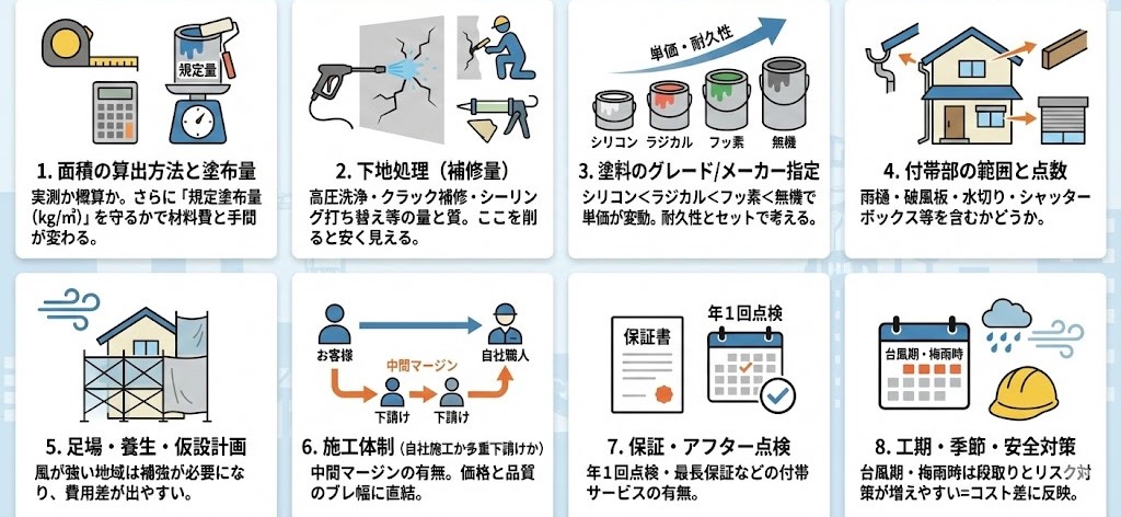 | 「A社は90万円、B社は130万円。何が違うの?」 塗装の見積は項目の出し方・工事範囲・塗料のグレード・下地の状態で大きく変わります。 |
