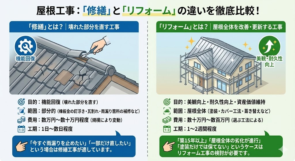 屋根に不具合を感じて調べ始めると、見積書や広告に**「リフォーム」と「修繕」の両方の言葉が出てきます。