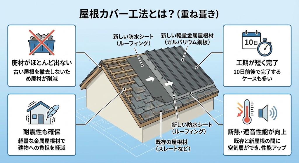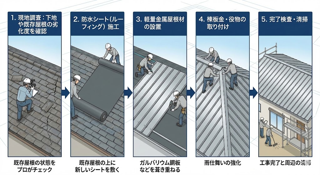 既存の屋根材を撤去せず、その上に新しい軽量金属屋根材(ガルバリウム鋼板など)を重ねて施工する方法です。
