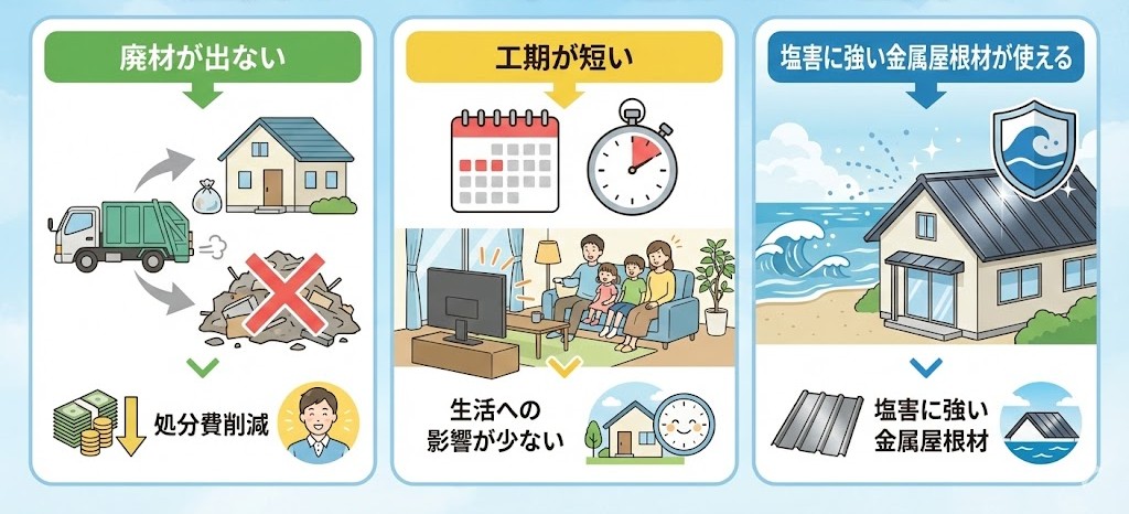 葺き替えに比べ1週間程度短縮できることもあり、雨季や台風前の工事に有利。