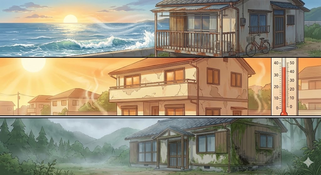 豊橋市はエリアごとに環境が異なり、 ●沿岸部(大清水・神野新田) → 塩害で金属部分のサビが出やすい ●内陸部(三ノ輪町・牛川町) → 夏の猛暑による塗膜劣化 ●山間部(石巻・嵩山) → 湿気やカビの発生 |