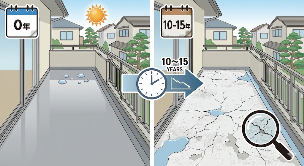 ●防水層の耐用年数:約10〜15年 ●表面のひび割れ・摩耗が出始めたら検討時期 |
