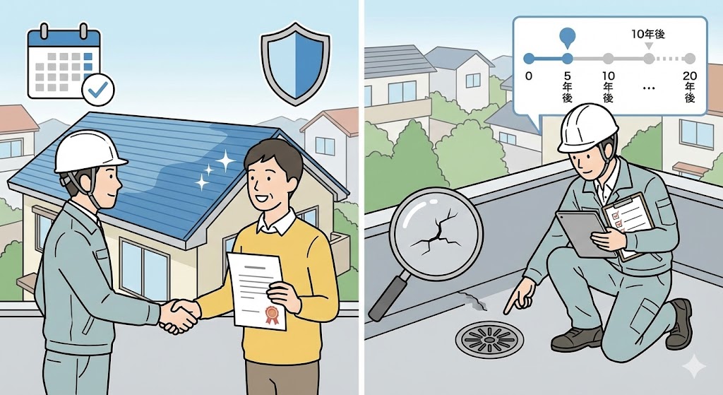 屋根防水工事は、施工後のフォローも重要です。 ●保証内容の確認 ●定期点検の有無 ●今後のメンテナンス時期 長く安心して住むためには、施工後の関係づくりも重要なポイントです。 |