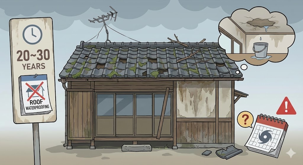 ●築20年以上が経過している ●屋根の色あせ・ひび割れが目立ってきた ●雨のあとに天井や壁にシミが出た ●台風・大雨のあとが心配 ●前回の防水工事から10年以上経っている |