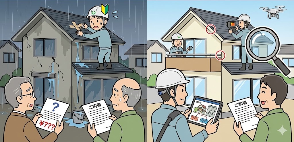 価格だけで決めたり、「とりあえず屋根を直す」といった曖昧な対応をすると、雨漏りが再発し、結果的に修理費用が高くなるケースが後を絶ちません。