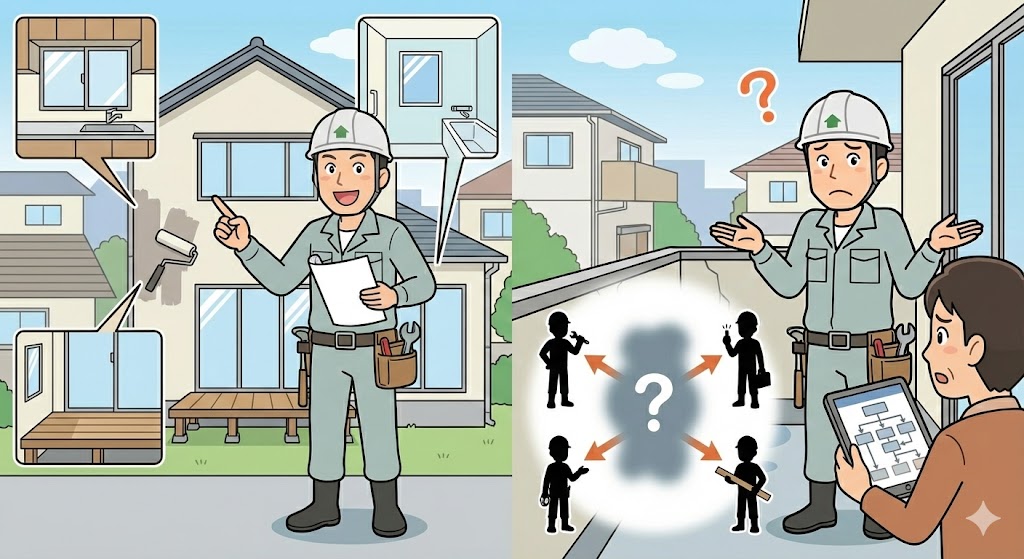 よくある失敗例: ●屋根だけ直したが、実は外壁が原因だった ●応急処置のみで再発した ●「一式工事」で内容が分からないまま契約した |