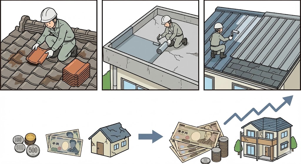 修理内容●瓦の調整・差し替え ●防水工事 ●屋根塗装・カバー工法 費用目安約3万円〜50万円以上(状態により変動) |