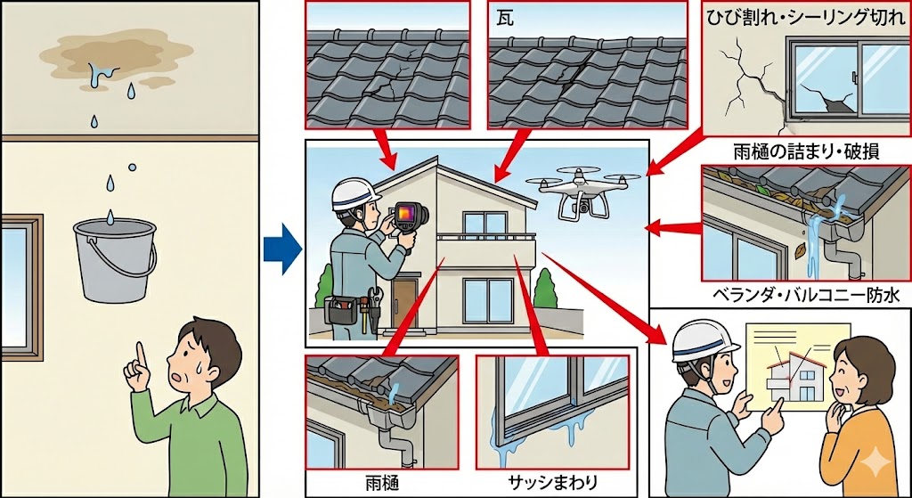 よくある原因: ●屋根の瓦ズレ・割れ・防水層劣化 ●外壁のひび割れ・シーリング切れ ●ベランダ・バルコニー防水の劣化 ●雨樋の詰まり・破損 ●サッシまわりの防水不良 見た目だけで判断すると、再発の原因になります。 |