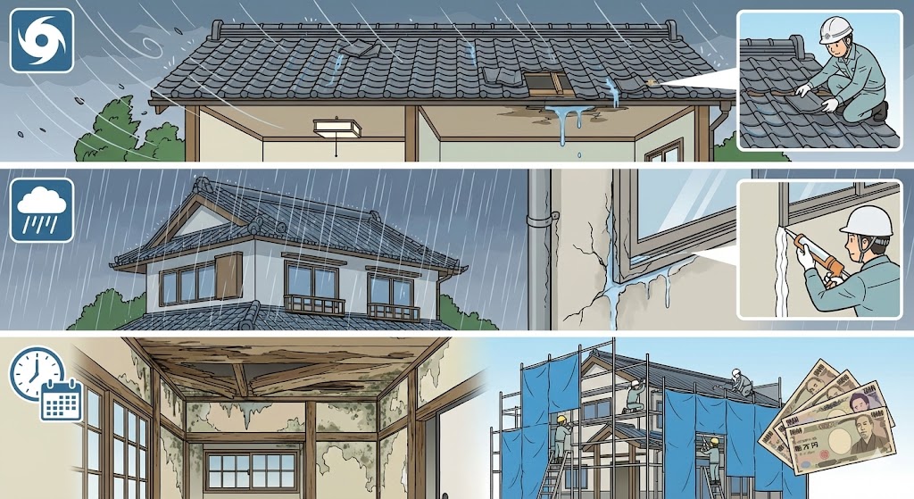 普段は問題がなくても、強い雨や風をきっかけに一気に症状が表面化することがあります。