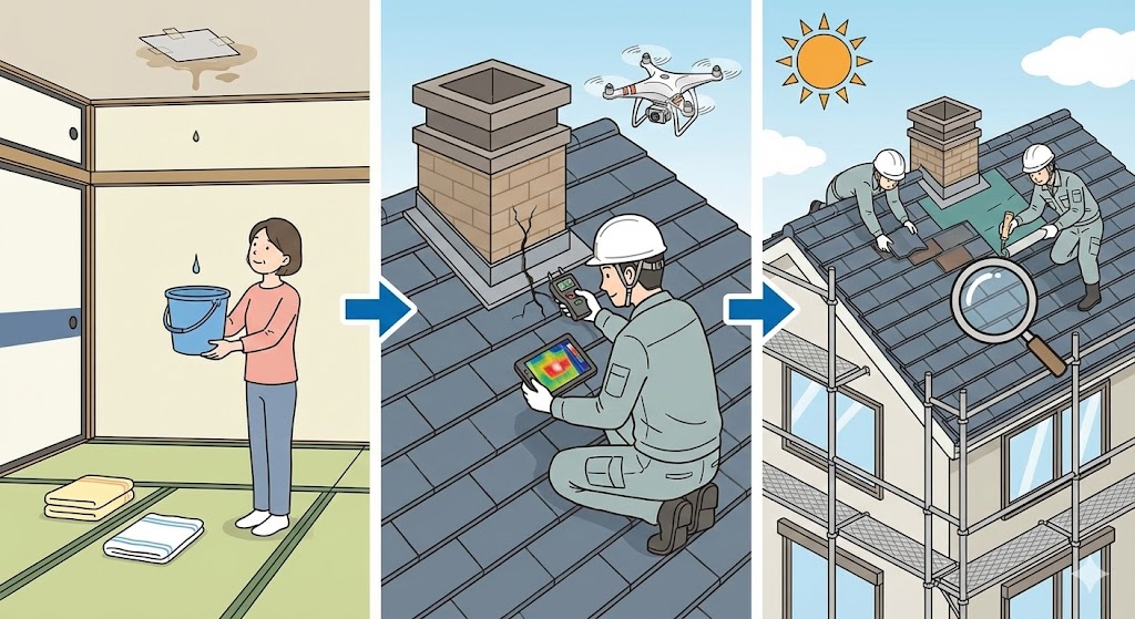 結論|突然の雨漏りは「応急対応 → 原因特定 → 根本修理」が正解です