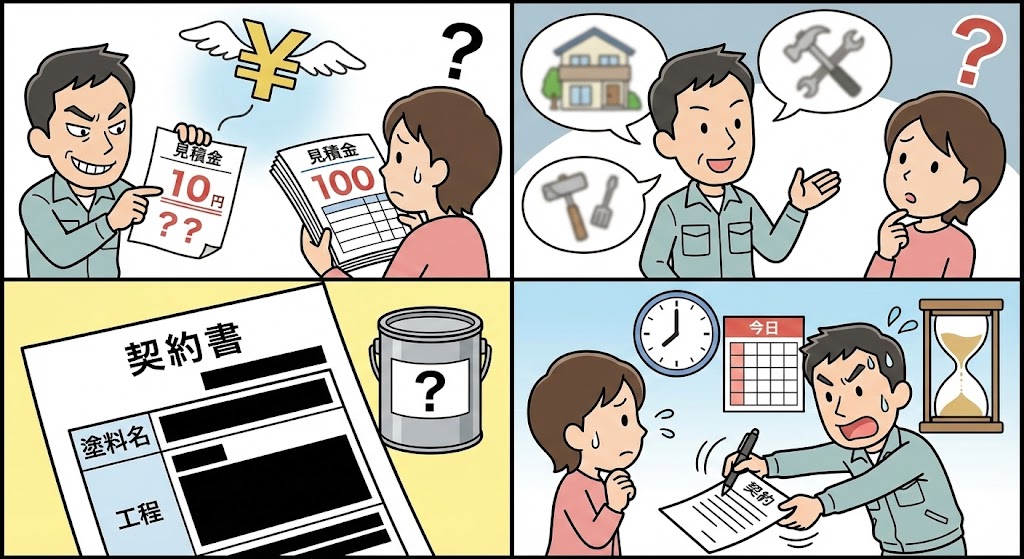 ●相場より極端に安い見積もり ●工事内容の説明があいまい ●塗料名・工程が書かれていない ●契約を急がせる 「なぜこの金額なのか」を説明できる業者かどうかが重要です。 |