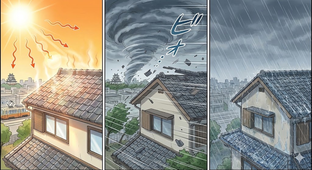 豊橋市は、 ●夏の強い紫外線 ●台風・強風による風雨 ●横殴りの雨が当たりやすい気候 といった環境条件により、屋根の防水性能が低下しやすい地域です。 |