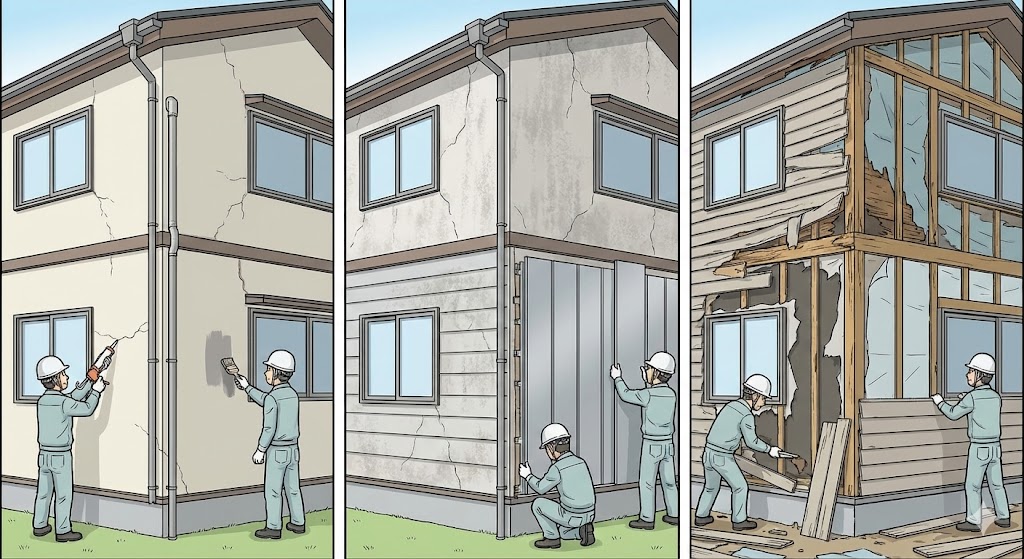 結論から言うと、 ●軽度の劣化 → 外壁補修 ●中度の劣化 → 重ね張り(カバー工法) ●重度の劣化 → 張り替え が基本的な考え方です。 |