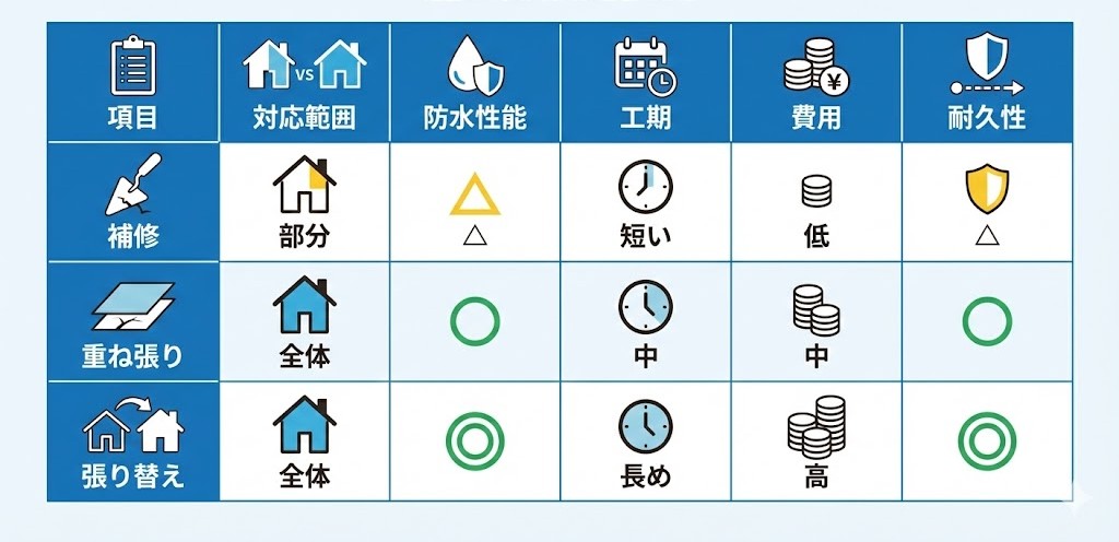 **「張り替えが必要?重ね張りで済む?それとも補修だけでいい?」**という点です。