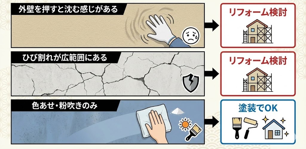 外壁の傷みは、塗装で守れる段階か、すでにリフォームが必要な段階かで対応が大きく変わります。