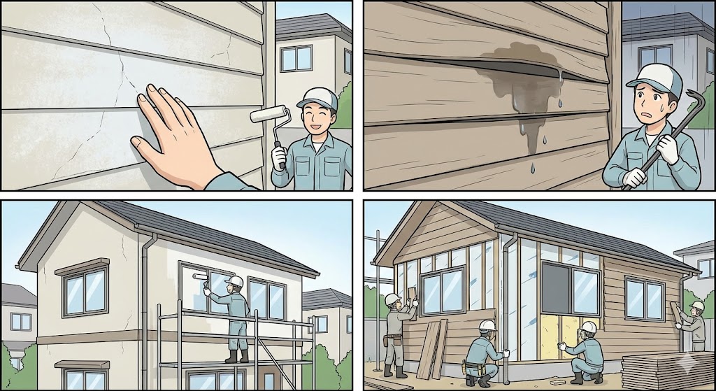 結論から言うと、 ●色あせ・軽度のひび割れ → 外壁塗装で対応可能 ●反り・浮き・雨水侵入 → 外壁リフォームが必要 が基本的な判断基準です。 |