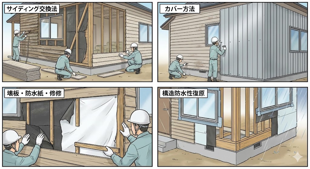 ●外壁材の張り替え ●外壁カバー工法(重ね張り) ●下地・防水紙の補修 ●構造的な防水性能の回復 |