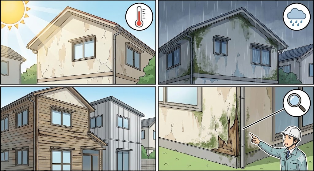 特に外壁は、 ●日当たり ●雨の当たり方 ●外壁材の種類 によって劣化の進み方が異なり、部分的に深刻な傷みが出やすいのが特徴です。 |