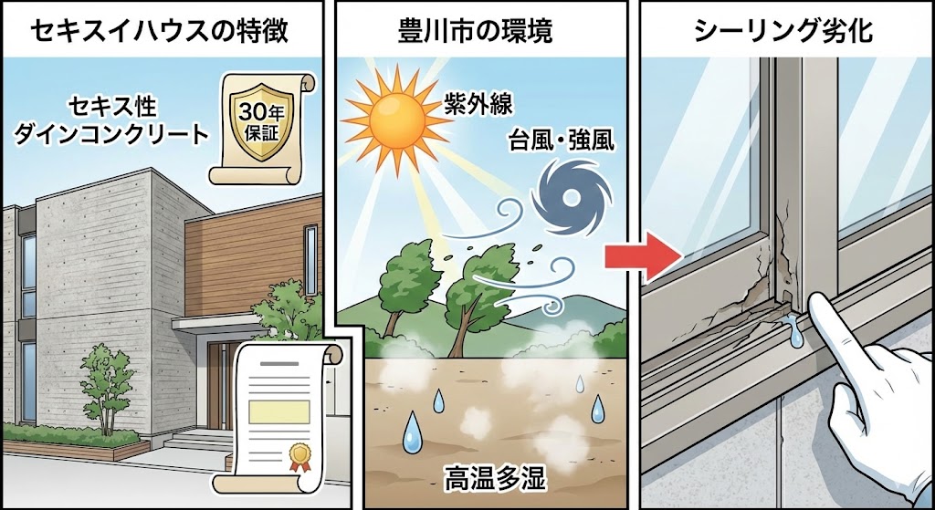 セキスイハウスは ●ダインコンクリート外壁 ●高耐久サイディング ●長期保証制度 が特徴です。 しかし豊川市は ●紫外線量が多い ●台風・強風の影響 ●高温多湿 |