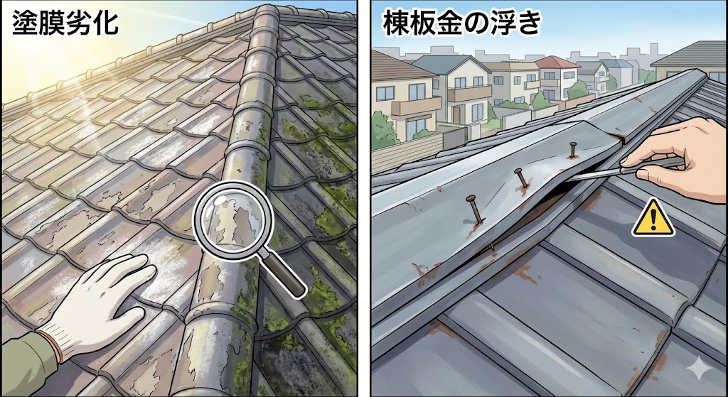 ●塗膜劣化が主な課題 ●棟板金の浮きに注意 |