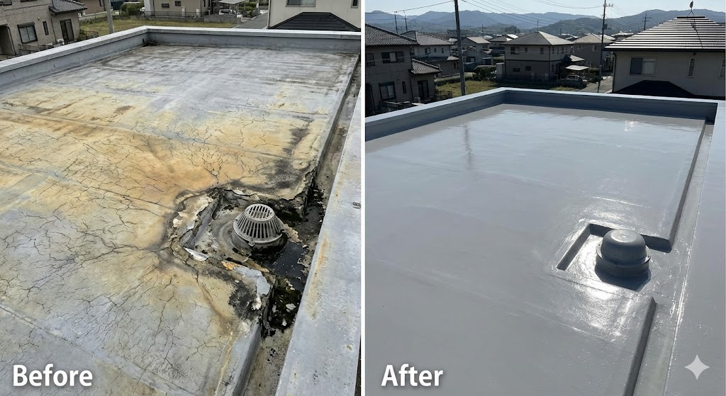【施工前】 ・防水層の色あせ 【施工後】 ・防水性能回復 |