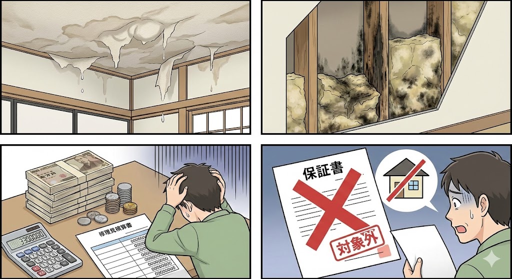 ●天井クロス浮き ●断熱材の腐食 ●修繕費の高額化 ●保証対象外になる可能性 |