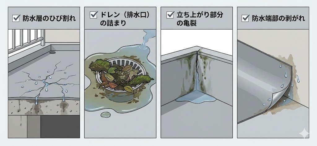 特に重要なのは、 ●防水トップコートの劣化確認 ●排水口(ドレン)周辺の詰まり ●シート防水・ウレタン防水のひび割れ ●立ち上がり部分の亀裂 築10〜15年で一度、本格的な防水点検を行うことが雨漏り予防の鍵です。 |