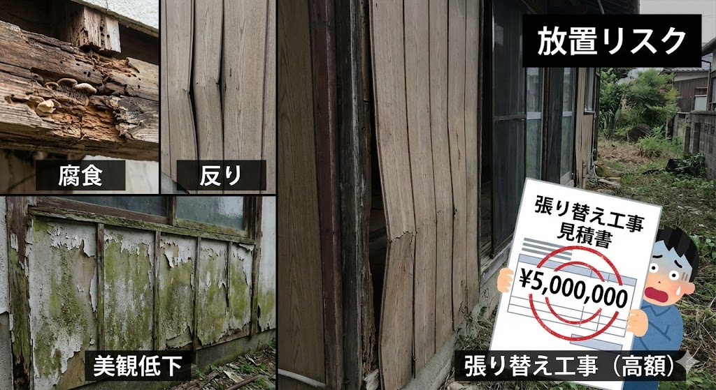 ●腐食 ●反り ●張り替え工事(高額) ●美観低下 早期メンテナンスが費用を抑えます。 |