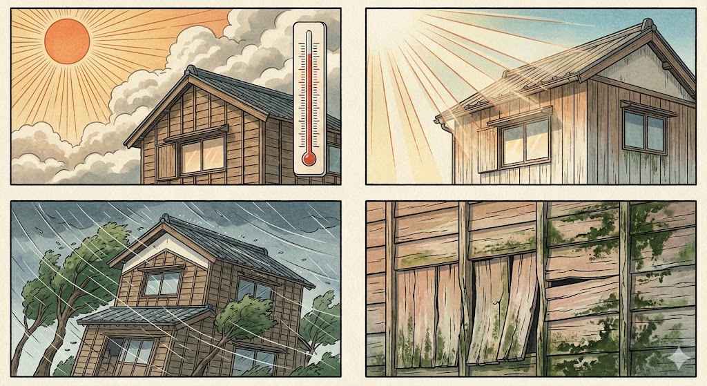 しかし木は ●紫外線に弱い ●水分を吸収しやすい ●乾燥と湿気を繰り返す そのため、定期メンテナンスが前提です。 |