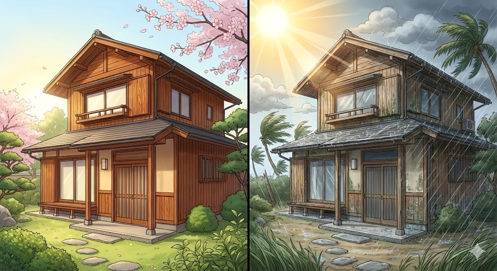 住友林業は ●無垢材や木質パネル外壁 ●木目を活かした意匠性 ●自然素材重視の設計 が特徴です。 豊川市は ●紫外線が強い ●高温多湿 ●台風・強風 この環境下では、木質外壁は特に影響を受けやすい素材です。 |