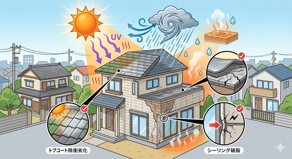 豊川市は ●紫外線が強い ●台風・豪雨が多い ●夏の高温多湿 この影響で ✔ トップコート退色 が進行しやすい地域です。 |