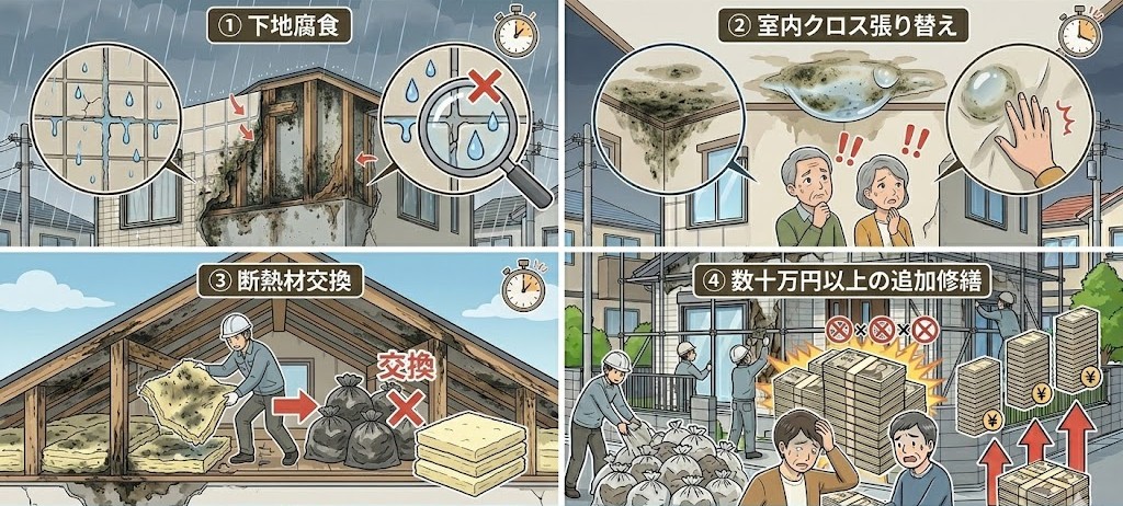 ●下地腐食 ●室内クロス張り替え ●断熱材交換 ●数十万円以上の追加修繕 防水は“見えない部分”だからこそ早めが大切です。 |