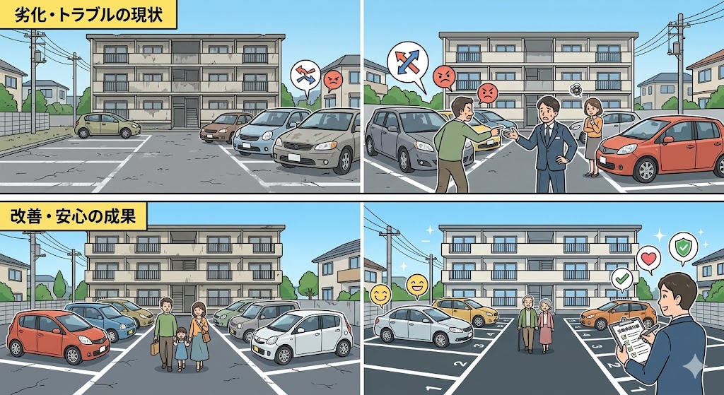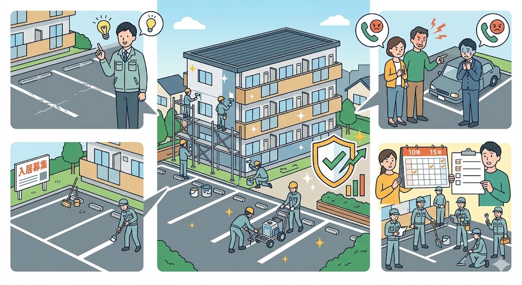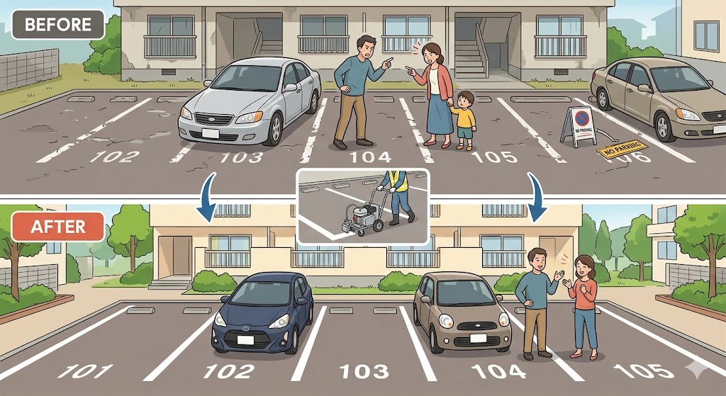 アパート・マンションの駐車場区画線は、単なる白線ではなく、入居者トラブルを防ぎ、建物の印象と資産価値を守る重要な設備です。