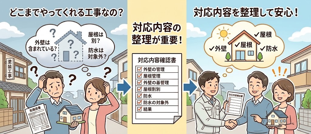 塗装工事で後悔する多くの原因は、**「どこまでやってくれる工事なのか分からなかった」**ことです。