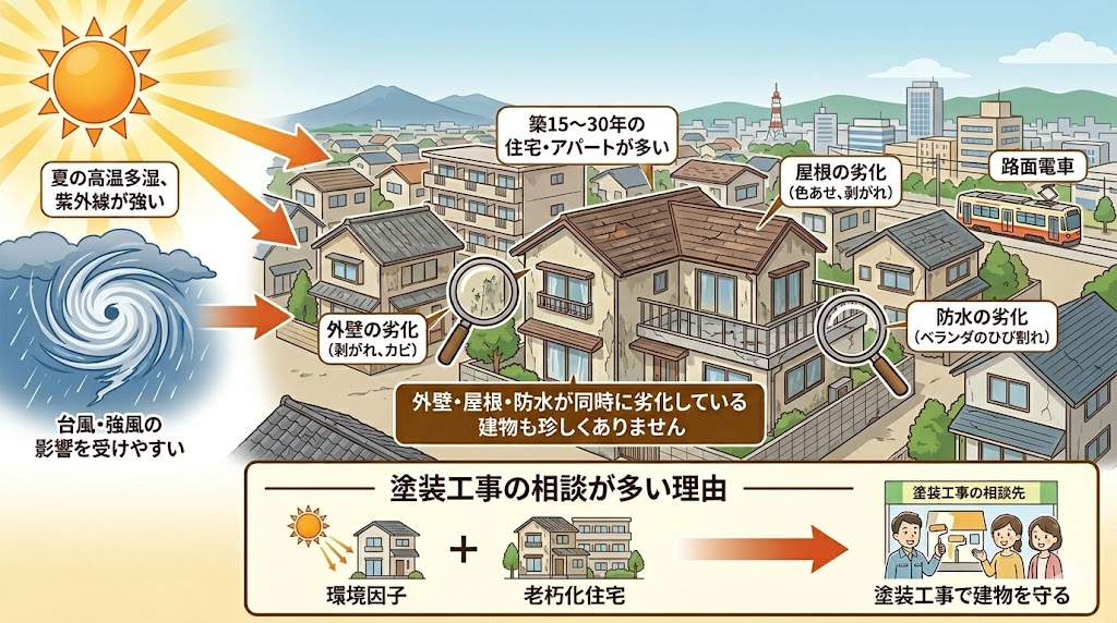 豊橋市は以下の特徴を持つ地域です。 ●夏は高温多湿、紫外線が強い ●台風・強風の影響を受けやすい ●築15〜30年の住宅・アパートが多い |