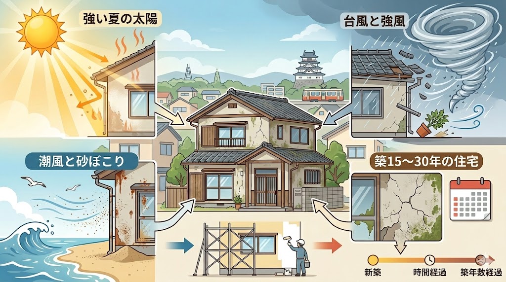 ●夏は紫外線が強い ●台風や強風の影響を受けやすい ●潮風・砂ぼこりの影響を受ける地域がある ●築15年以上の住宅が多い |