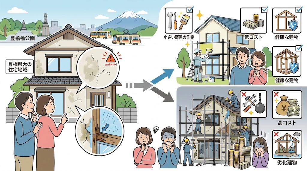 豊橋市でも、この段階で塗り替えを行った住宅と、放置してから工事を行った住宅とでは、