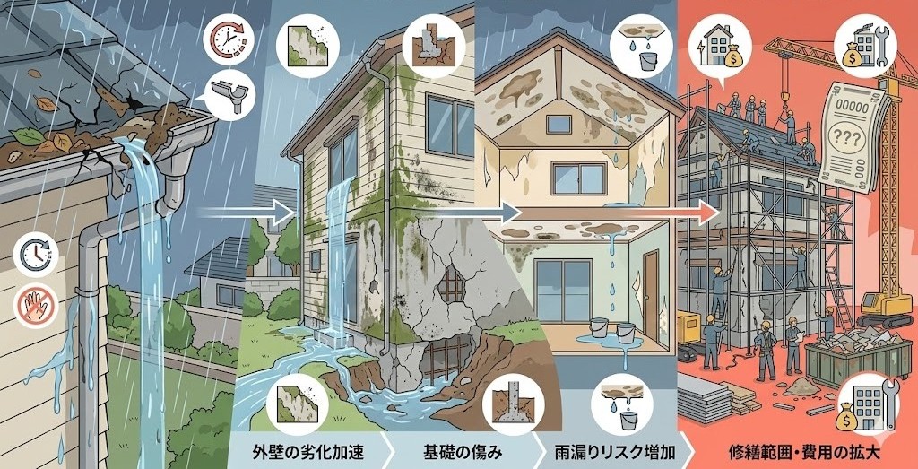 ●外壁の劣化加速 ●基礎の傷み ●雨漏りリスク増加 ●修繕範囲・費用の拡大 |