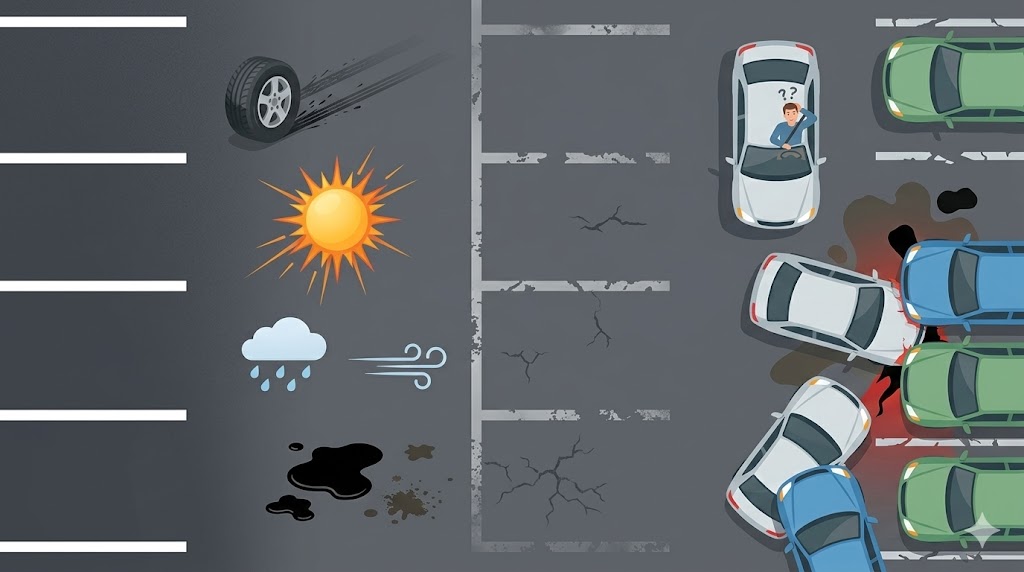 区画線は、時間とともに必ず劣化します。 劣化の原因: ●車のタイヤ摩耗 ●紫外線 ●雨・風 ●オイル汚れ |